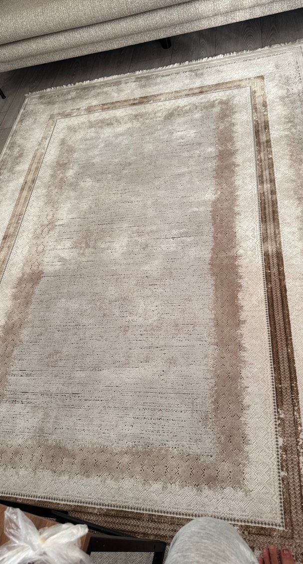 Bej ve gri tonlarında modern klasik halı, yumuşak dokulu ve hafif bordür desenli. Her odaya sıcaklık katar. 230-200