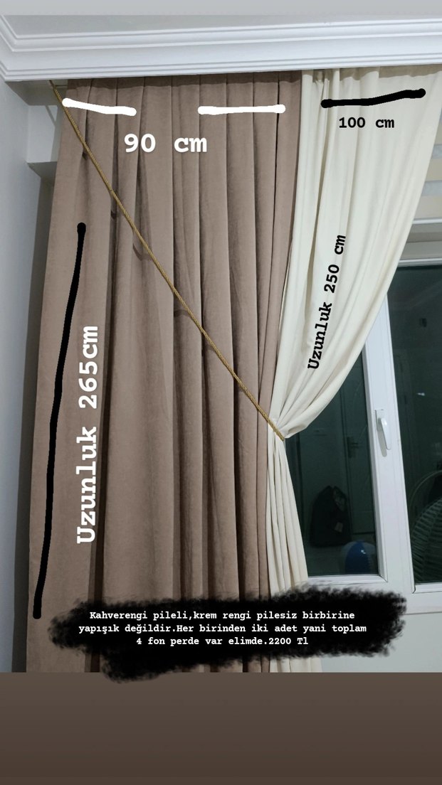 Modern klasik tarzda, kahverengi pileli ve krem rengi pilesiz olmak üzere toplam dört fon perde. Eni 90-100 cm, uzunluğu 250-265 cm arasında değişmektedir.