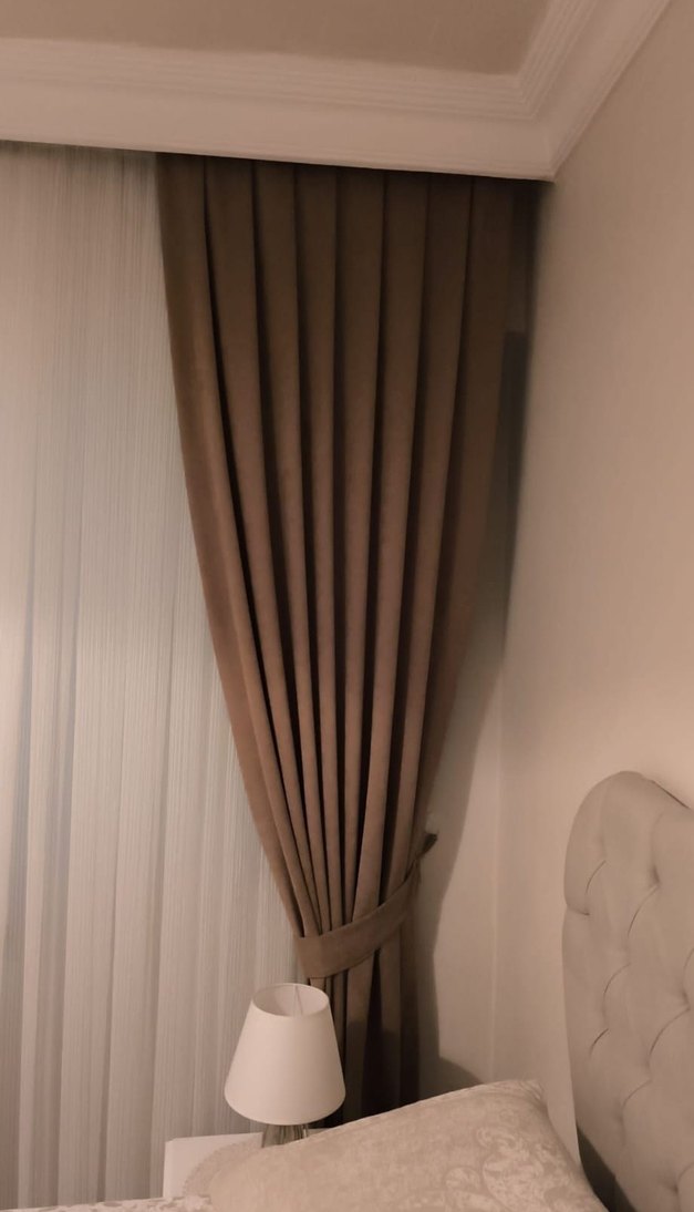 Sütlü kahve renginde modern klasik tarzda, düz dokulu ve gri tonlarında bej perde, mekâna zarif bir dokunuş katıyor.