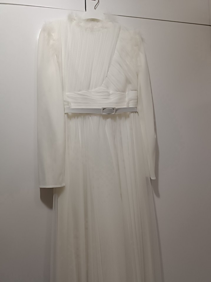 Uzun beyaz A kesim elbise, kayık yaka ve askılı tasarıma sahiptir. Kemer detaylı, modern klasik ve minimalist şıklığı bir araya getirir. Bir kez giyildi.
