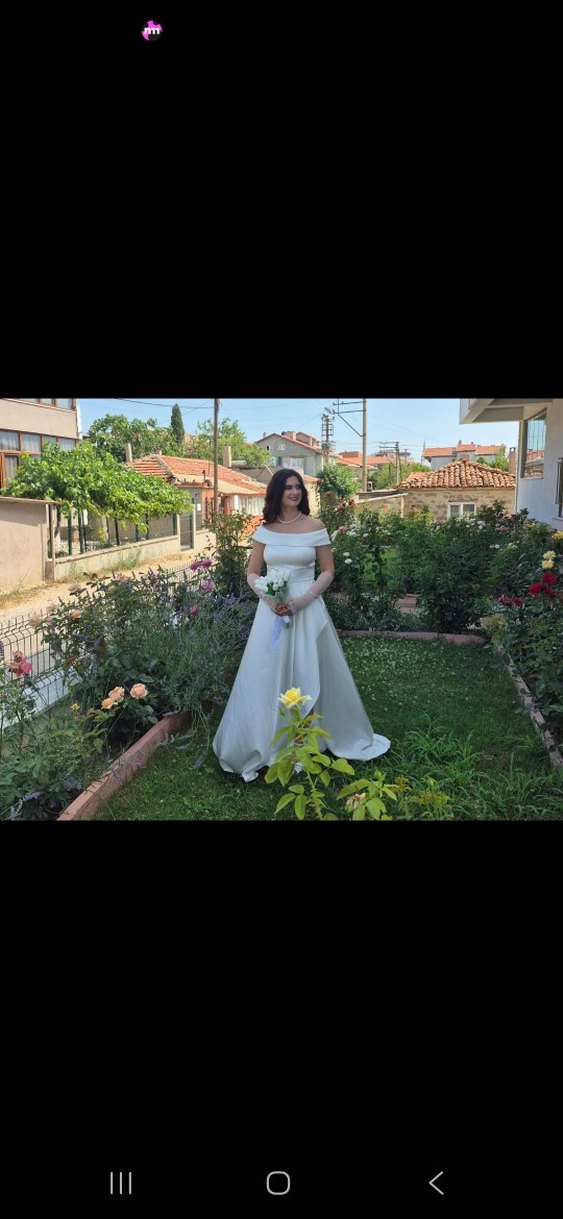 Modern klasik beyaz gelinlik, straplez yaka ve ince askılı, bol kesim yapısıyla bohem tarzı yansıtır.