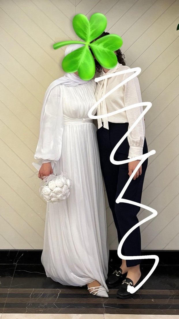 Modern klasik tarzda, straplez yakalı ve askılı kollu, bol kesim uzun beyaz A-line gelinlik. Modest avant-garde detaylar içerir.