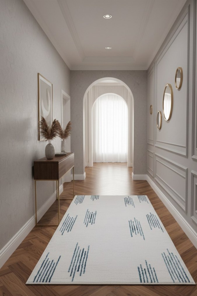 Modern klasik tarzda, beyaz zemin üzerine gri baskılı desenlere sahip yumuşak dokulu halı. Her mekana zarif bir dokunuş katar.