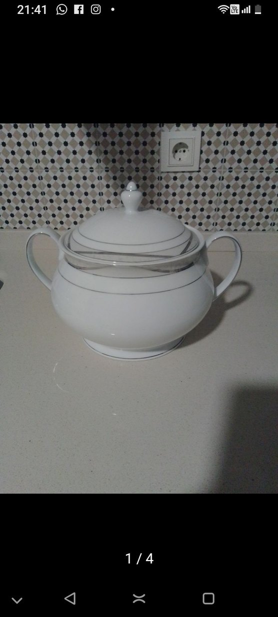 İnce gri çizgilerle modern klasik tasarıma sahip, kapaklı ve çift kulplu beyaz porselen çorba tenceresi. ️