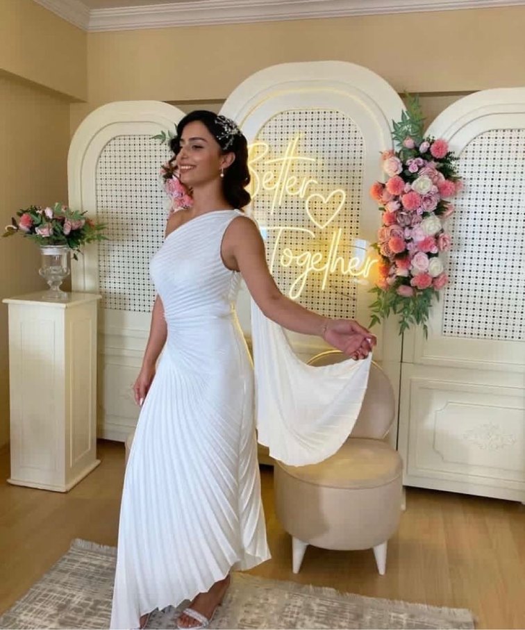 Tek omzu pelerinli beyaz Alfa Beta elbise, pileli ve midi boy ben çok severek giydim.