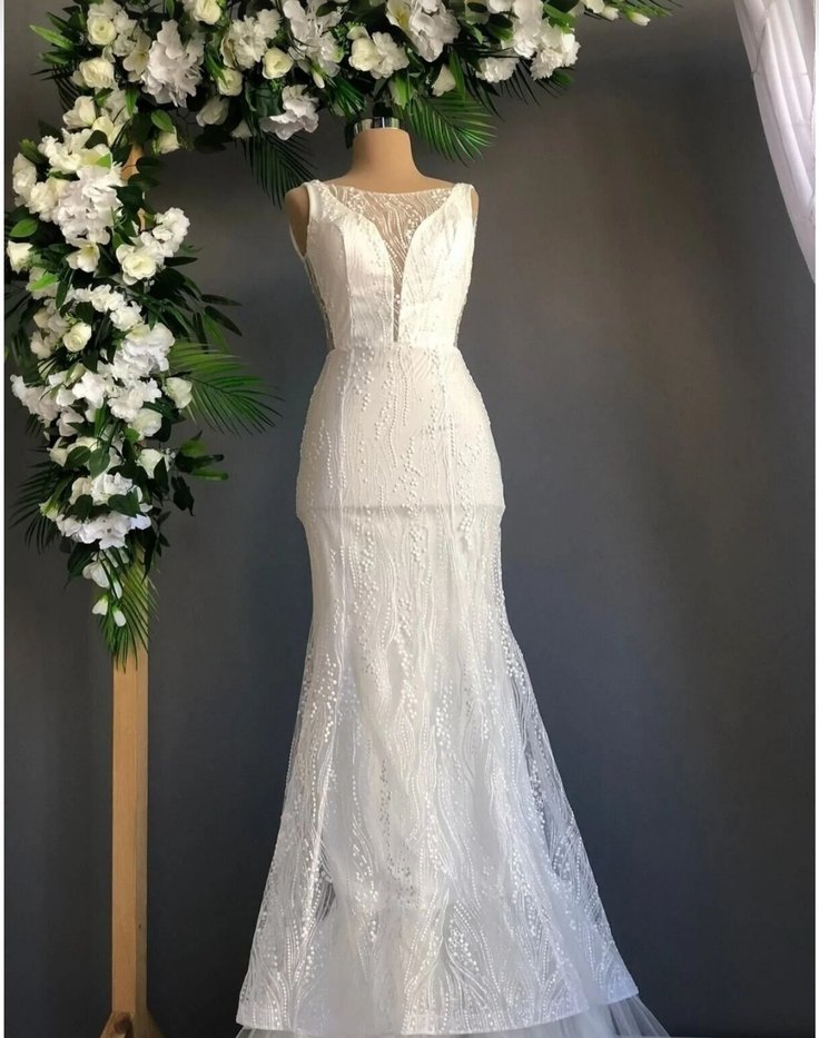 Modern klasik tarzda, kolsuz ve V yakalı beyaz gelinlik. A kesim, uzun boy ve sade dantel detaylı, klasik şıklık için ideal. Simli. Bu ürün sıfır!! Denemedim bile. Aldım ama başka elbise ile evlendim.