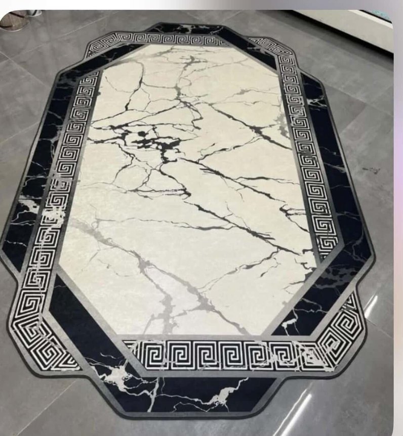 Modern klasik tarzda, beyaz ve gri tonlarda mermer desenli ve geometrik bordürlü baskılı halı.