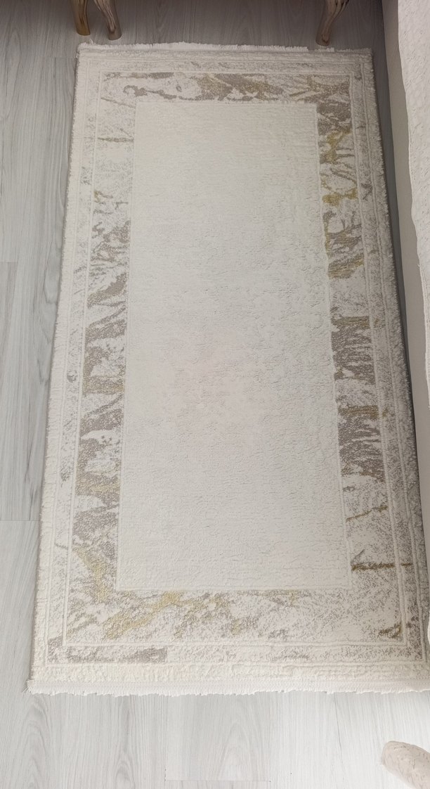 Modern klasik tarzda, beyaz zemin üzerine gri tonlarında çerçeve detayları bulunan, desensiz şık bir halı üçlü yatak odası