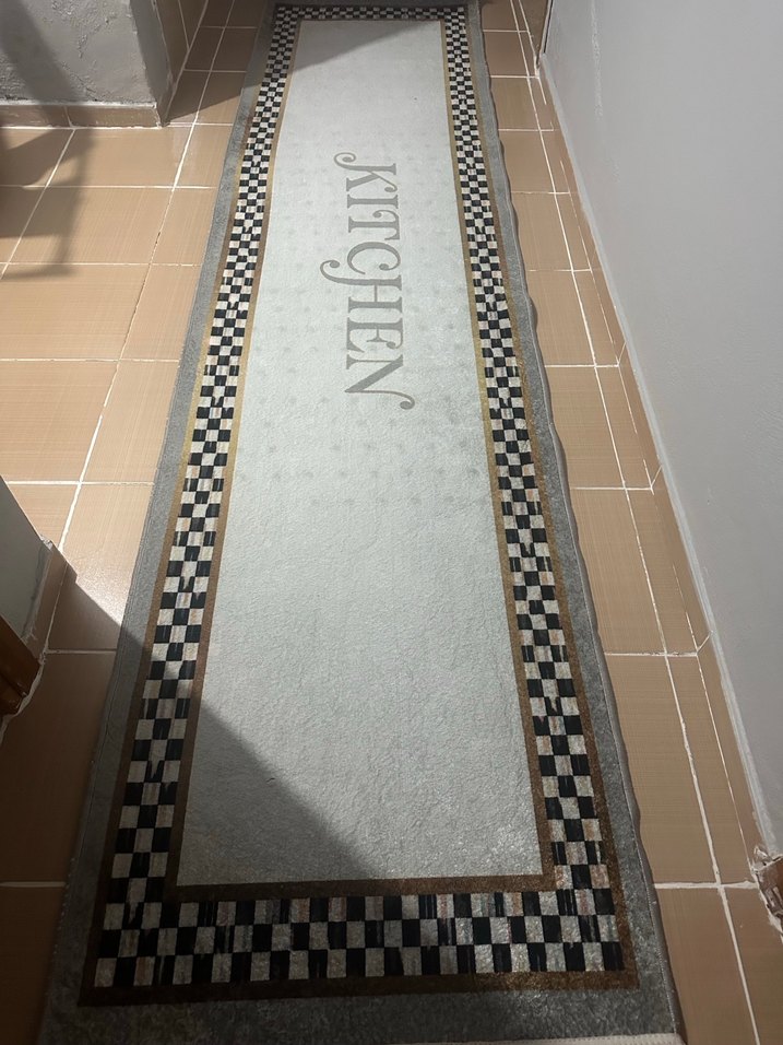Modern klasik tarzda, gri ve siyah kare desenli çerçevesi olan beyaz merkezli ve üzerinde 'KITCHEN' yazısı bulunan mutfak halısıdır.