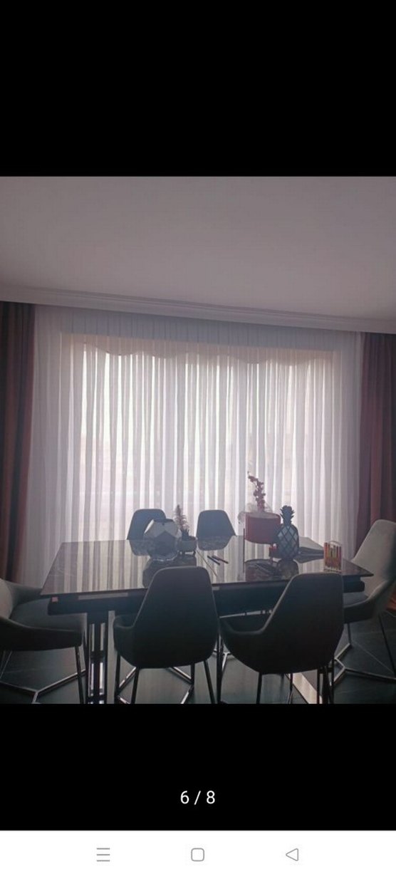 Beyaz ve gri renkte, desen içermeyen modern klasik perde. Hafif ışık geçirir ve sakin bir ortam yaratır. en 280boy255