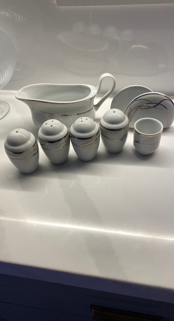 Modern klasik beyaz ve gri porselen baharat seti, tuzluk, biberlik, sosluk ve küçük fincanlardan oluşur, desensiz ve sade tasarımlıdır. ️
