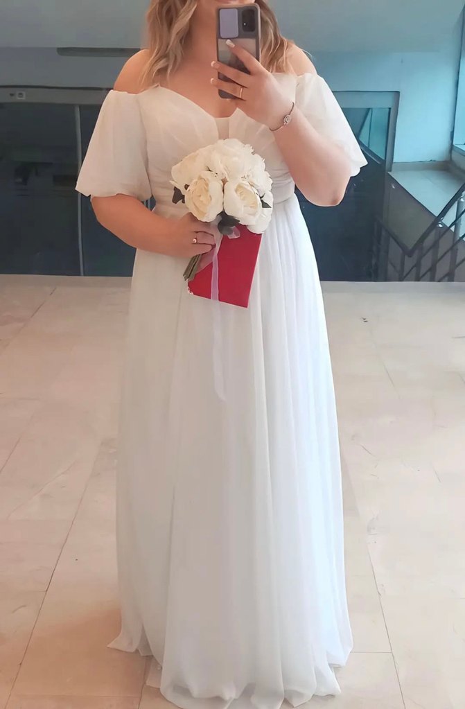 Beyaz midi uzunlukta, straplez yaka ve kısa kollu, bol kesim modern klasik ve minimalist tarzda A kesim nikah elbisesi arkasını ipli yaptırdım xl ve xxl beden rahat olur