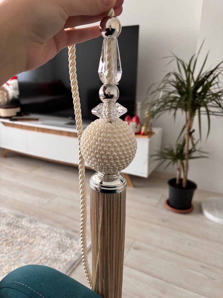 Modern klasik tarzda, parlak beyaz renkli ve nakışlı detaylara sahip perde bağıdır. İnci görünümlü süs ve sağlam ip içerir. Hiç kullanılmadı görsellerden anlayabilirsiniz.