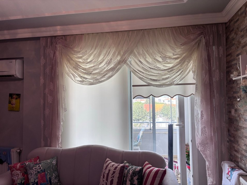 Modern klasik tarzda, hafif kumaştan beyaz nakışlı tül perdeler. Işığı yumuşakça süzerek şık bir görünüm sağlar. Ölçüler 3.80-2.64 3.00-2.64