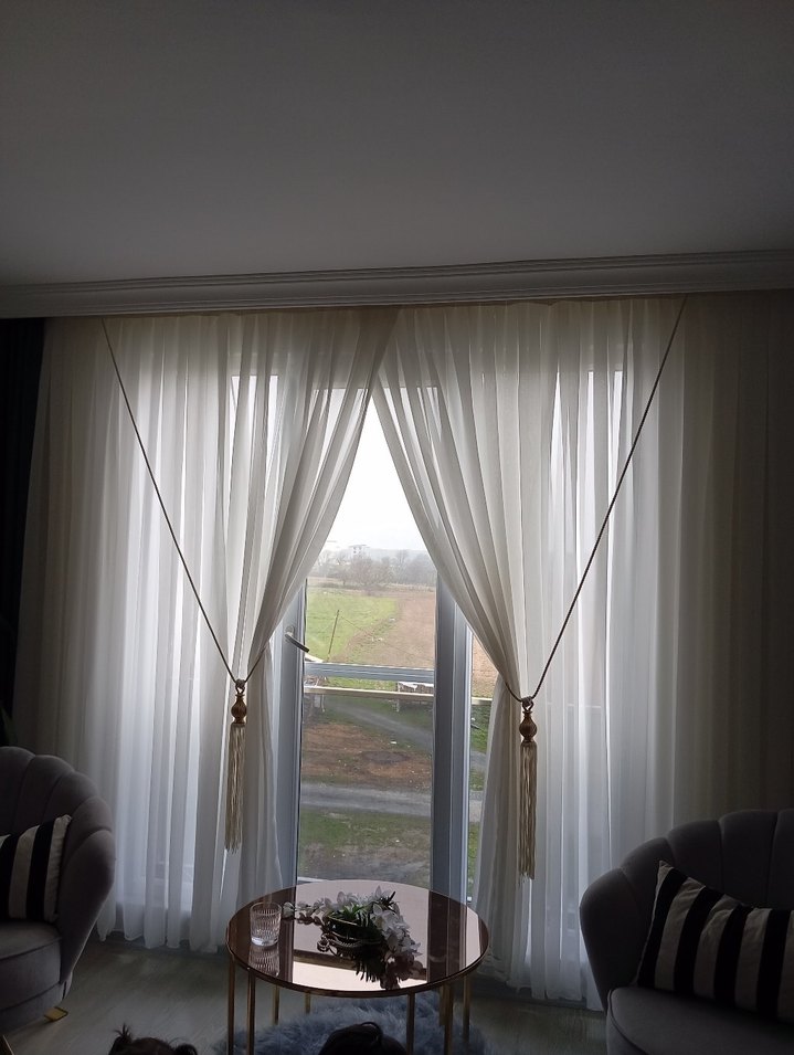 Modern klasik tarzda beyaz, desensiz ve hafif kumaştan yapılmış perdeler. Doğal ışığı yumuşakça dağıtarak ferah bir atmosfer yaratır. kusursuzDur 400*250sk pile aksesuarlari ile beraber