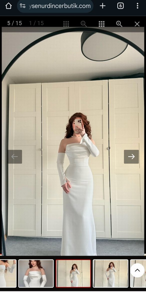 Beyaz, tek kollu, straplez yaka ve vücuda oturan kesimiyle modern klasik stil sunan minimalist gelinlik. Zarif ve şık bir siluet sağlar.