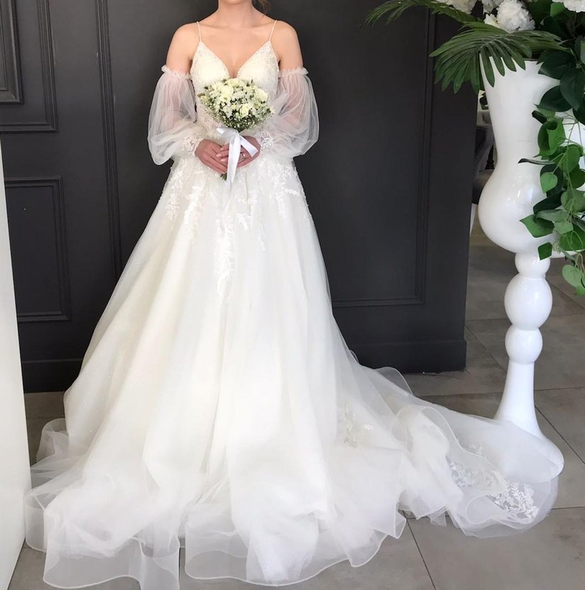 Uzun beyaz gelinlik, straplez yaka ve askılı, bol kesim kollarıyla modern klasik tarzda şık bir A-kesim siluete sahiptir. Özel tasarım helen model gelinlik. Giydiğimde 48 kiloydum. Arkası fermuarlı olduğu için açılma payı yok. Kollarını kendim yaptırdım isteğe göre takılıp çıkarılabiliyor. Kuru temizlemesi yapılmıştır.