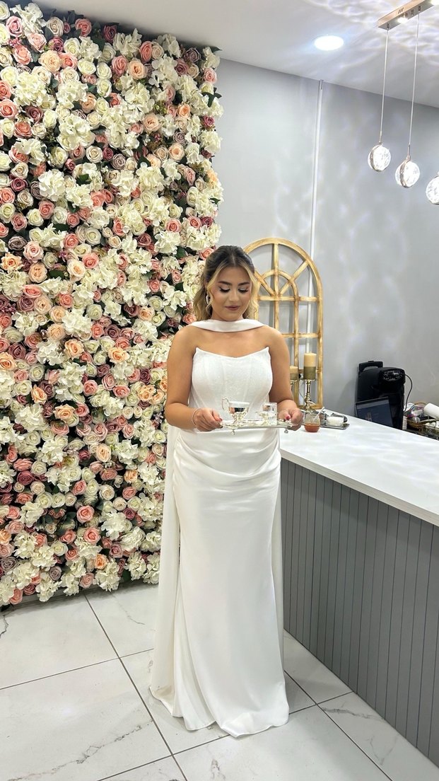 Modern klasik tarzda, straplez yakalı, drapeli ve desenli beyaz uzun abiye. Düzenli kesim ile şık ve gösterişli bir düğün elbisesi. 168 cm boyundayım ve 65-70 kilo m-l beden herkese çok iyi olacağına eminim. Özel dikim bir kez nişanımda giydim