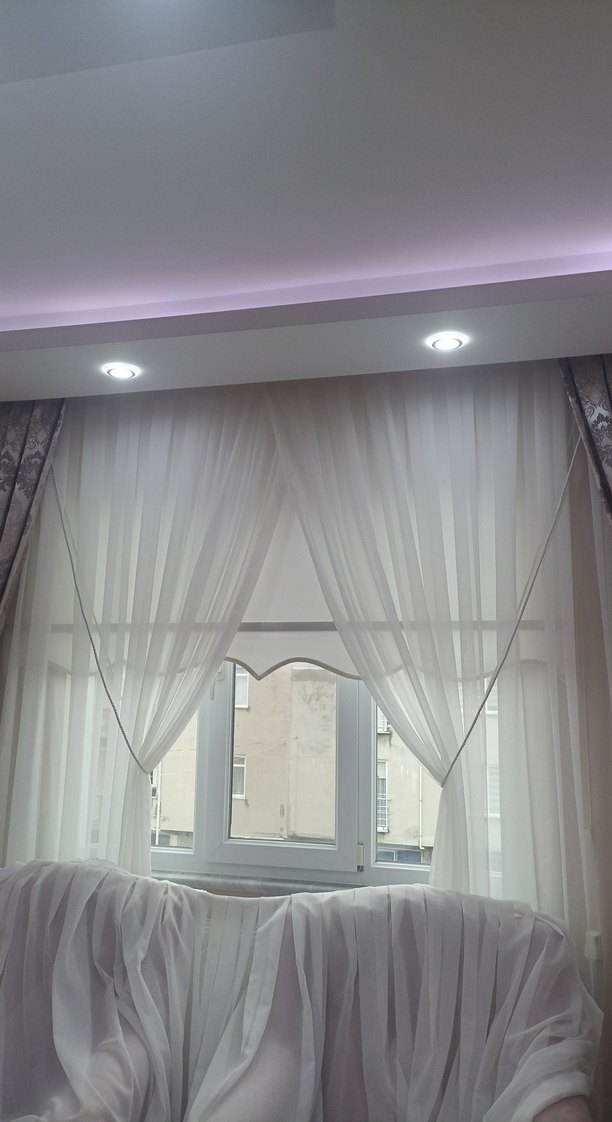 Modern klasik tarzda, hafif desen içermeyen beyaz tül perde, yumuşak ışık geçirir ve ferah bir ortam sağlar.