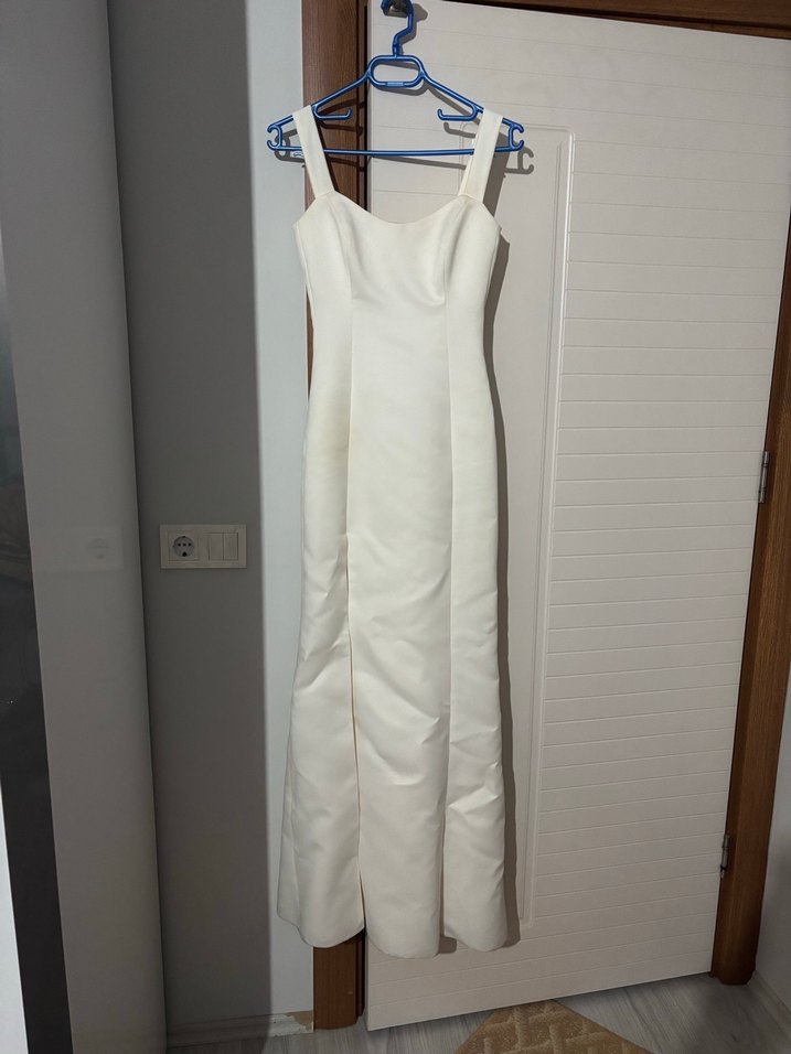 Uzun, dar kesim beyaz gelinlik, askısız ve kolsuz tasarımıyla minimal ve modern klasik tarzı bir araya getiriyor. Özel Dikim 1 kez giyildi