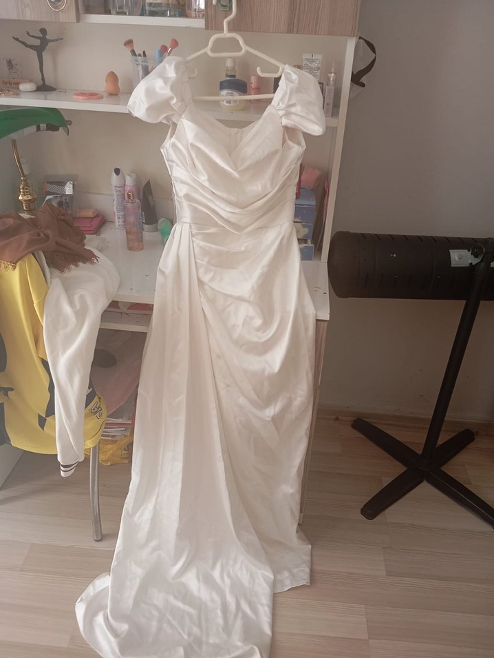 ürün 1 kere giyildi sorunsuz 4500 e aldım defosu yok Uzun beyaz elbise, straplez yakalı ve bol kesimli, modern klasik tarzda, vintage düğünler için uygun.