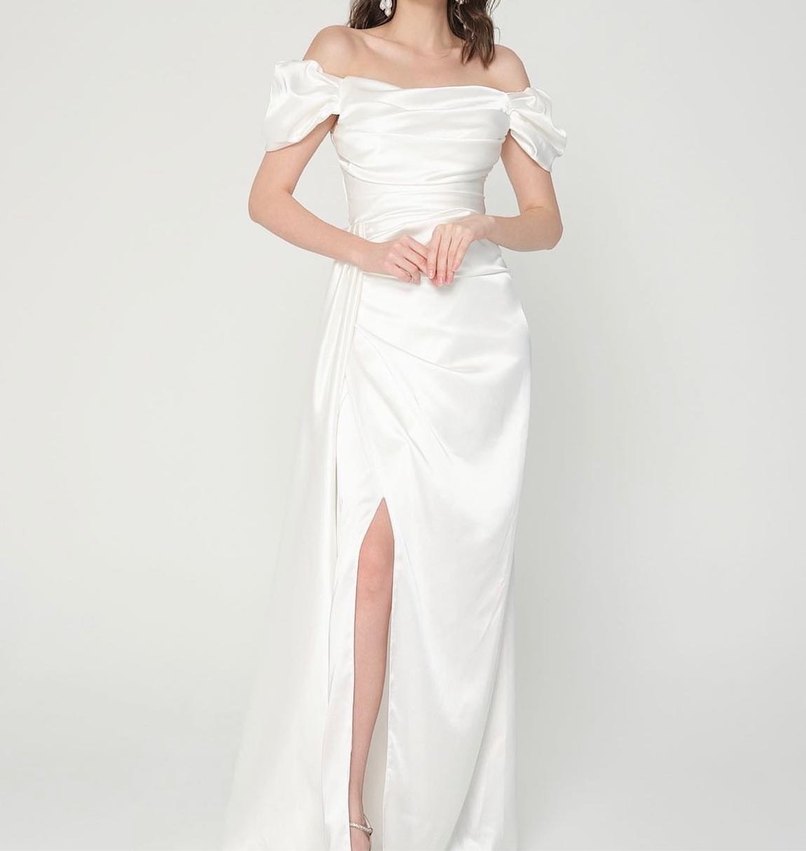 Bu beyaz, vücuda oturan gelinlik, tekne yakası ve askılı kollara sahiptir. Modern klasik tarzı ve uzun etek boyu ile göz alıcı bir şıklık sunar. Beden 38 bedene sncak olur 58 59 iken giydim