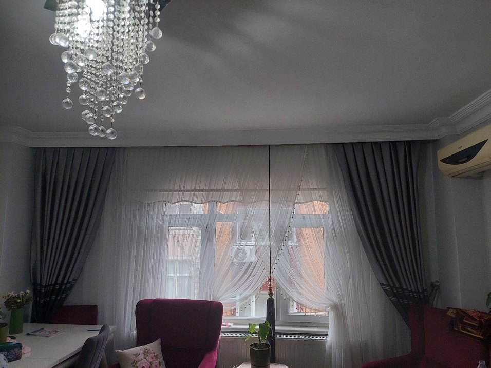 Modern klasik tarzda, ve gri yan panellerden oluşan, desen içermeyen şık ve sade perde. orta süs dahildir..tül eni 4 m2 dir