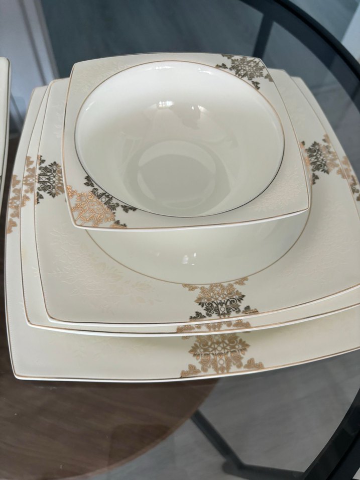 Modern klasik tarzda, beyaz renkli, gri ve bej tonlarında çiçek desenli kare tabaklar ve kase içeren yemek takımı. ️ 12 adet servis tabağı 12 adet pasta tabağı 12 adet çorba kasesi 3 adet küçük 1 adet büyük kayık tabak 2 adet tuzluk 2 adet karabiberlik 2 adet kürdanlık Büyük çorba tenceresi(aynı renk ve desen) 12 adet kahve fincanı 12 adet çay fincanı 12 adet su bardağı 12 adet kadeh