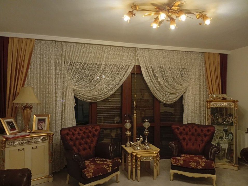 Modern klasik tarzda, desenli ve parlak bordo renkte perde, mekâna şıklık katıyor. 5.5 metre tül ve fon perdesi dâhil şık salon perdesi
