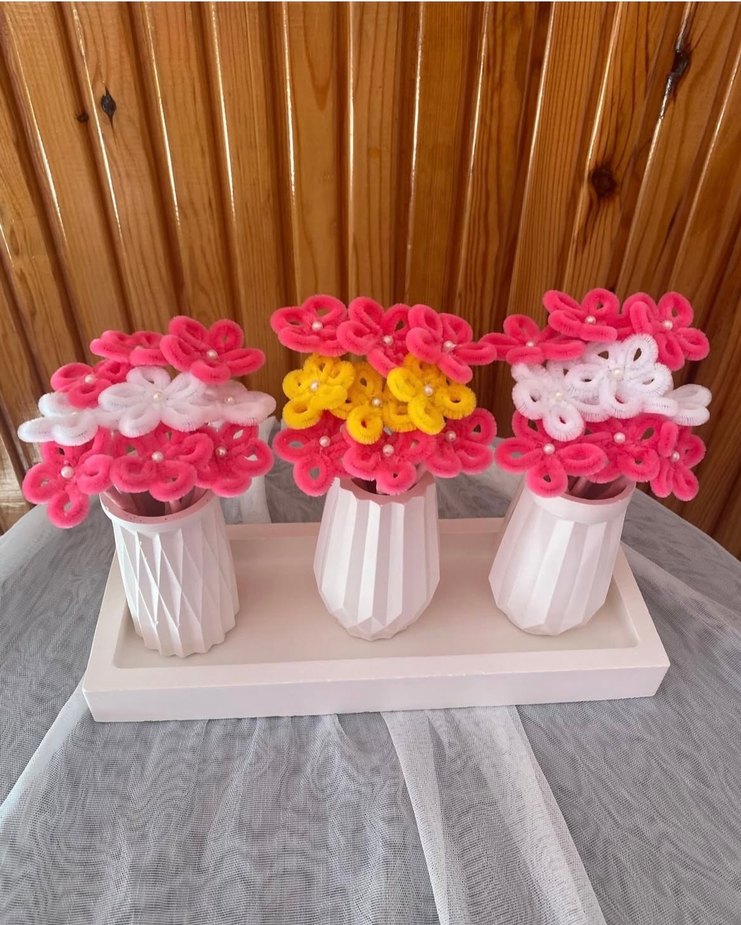 Bu üçlü şönil çiçek seti sevdikleriniz için harika kalıcı bir hediye olacaktır.Vazolar görsel amaçlıdır