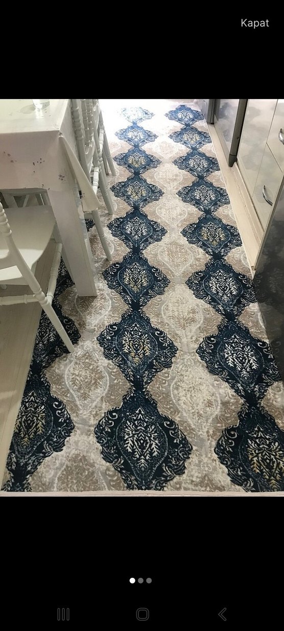 100 en /300 boy Modern klasik tarzda, mavi ve gri tonlarda desenli halı. Şık ve zarif görünümü ile farklı dekorasyonlara uyum sağlar.