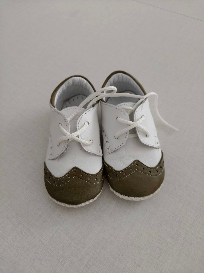 Erkek bebekler için modern klasik tarzda, beyaz ve gri renkte, düz desenli kauçuk ilk adım ayakkabısıdır.