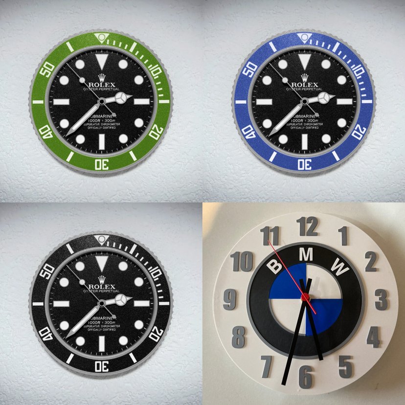 Modern klasik erkek duvar saatleri, minimalist tasarımlı, koyu tonlarda ve net beyaz detaylara sahip. BMW temalı saat de dahil, belirgin rakamlar içerir. kendi üretimimizdir 3d baskiyla oluşuyor.