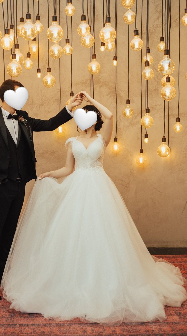 Beyaz A-line gelinlik, straplez yakalı ve askılı kollu, uzun ve vücuda oturan etek tasarımıyla modern klasik ve hafif gotik tarzı yansıtıyor. Hiçbir deformesi yoktur. Kuru temizleme ihtiyacı vardır.