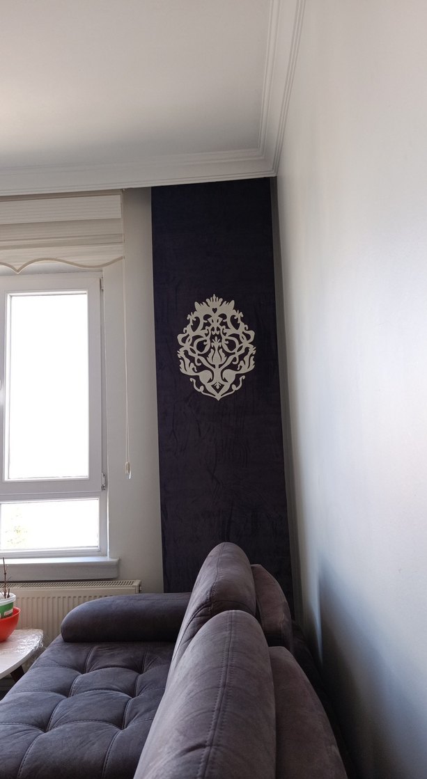 Modern klasik tarzda, gri renkte baskılı dekoratif desenli perde. Odaya zarif bir dokunuş katıyor.
