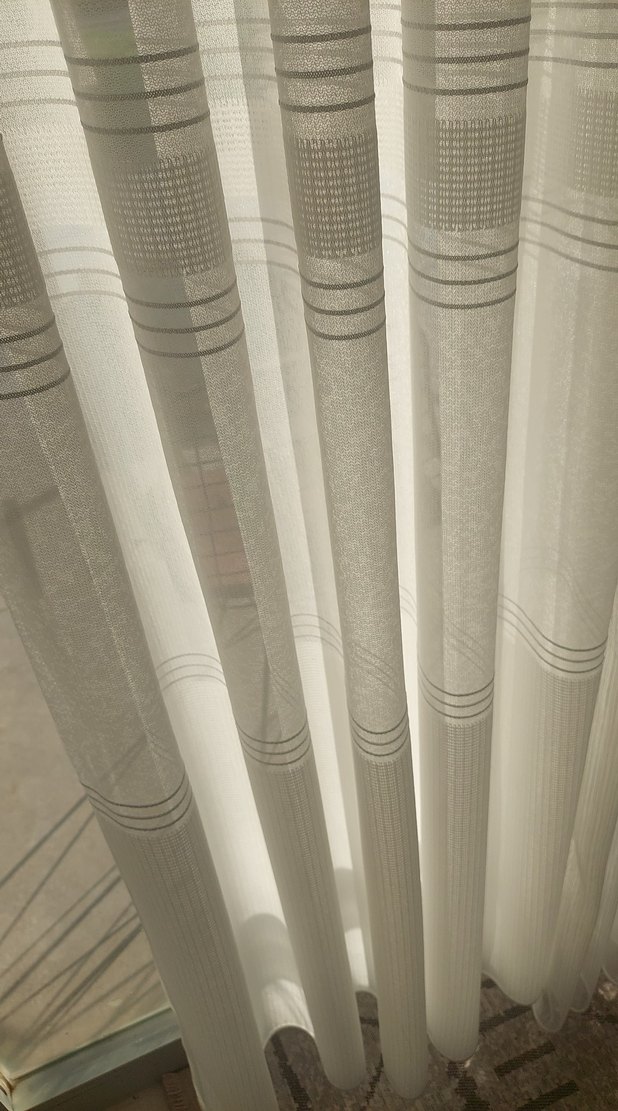 Modern klasik stilinde, beyaz zemin üzerine gri çizgili desenler bulunan perde. Hafif ışık geçirir ve şık bir atmosfer yaratır.