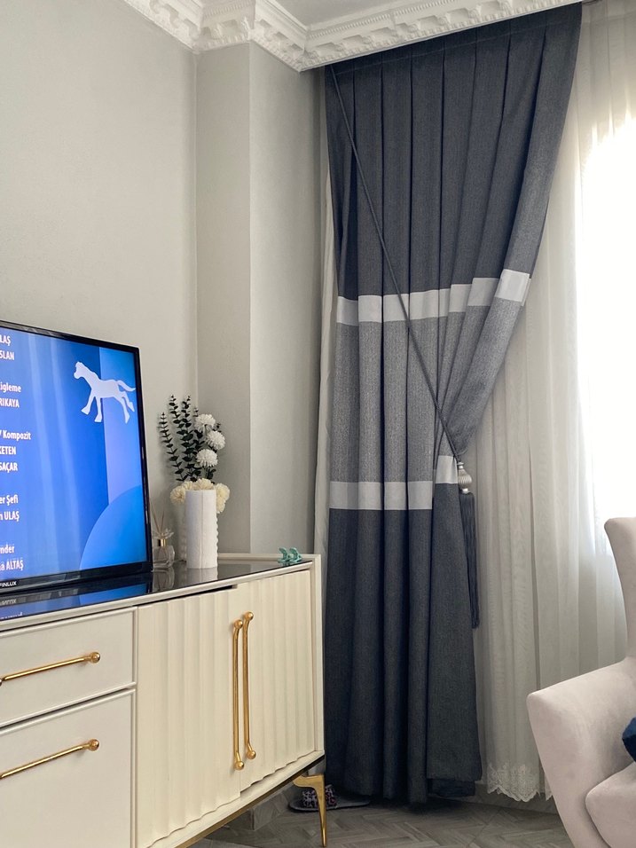 Modern klasik tarzda, gri renkli, yatay çizgili desenli perde. Katlı duruşuyla şık ve sade bir görünüm sunar.