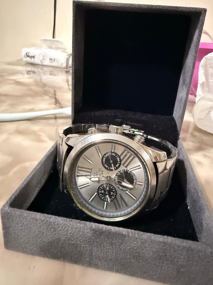 Gri kadranlı, Roma rakamlı ve üç alt kadranlı erkek kol saati. Parlak metal kasası ve uyumlu metal kayışıyla modern klasik Paris tarzı sunar. ⌚Bigotti saat