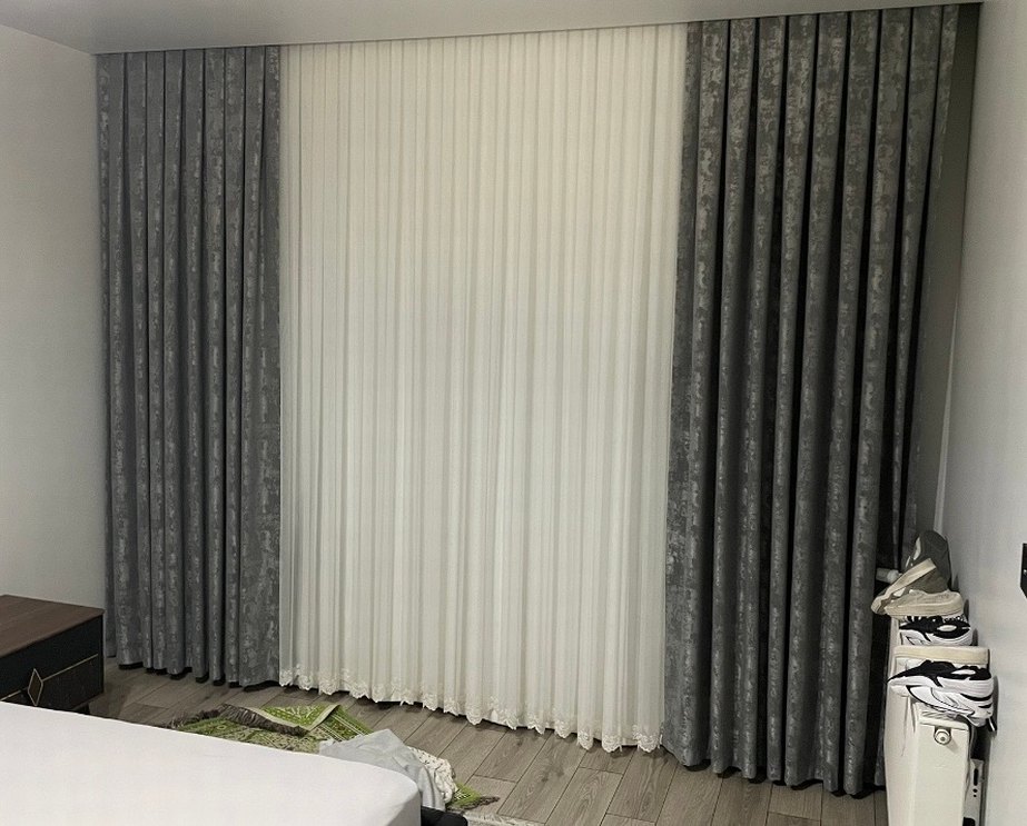 gri modern fon perde, sade ve şık bir görünüm sunar.