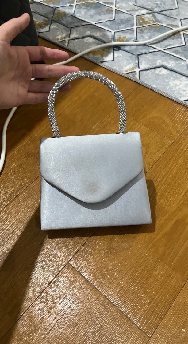 Gri renkte, tokalı kapaklı, ışıltılı saplı sentetik kumaştan yapılmış kadın çantası. Modern klasik tarzı ve düğünler için uygun. Bir kere kullanıldı
