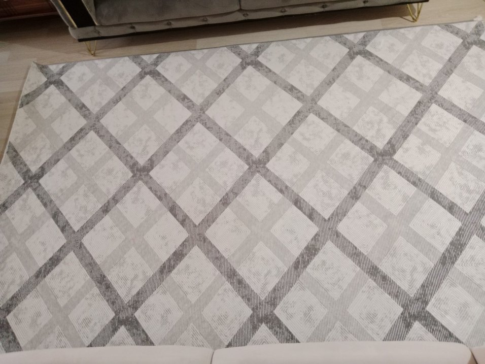 Modern klasik tarzda, gri tonlarında kareli desene sahip halı. Sade ve şık bir görünüm sunar. 300×200