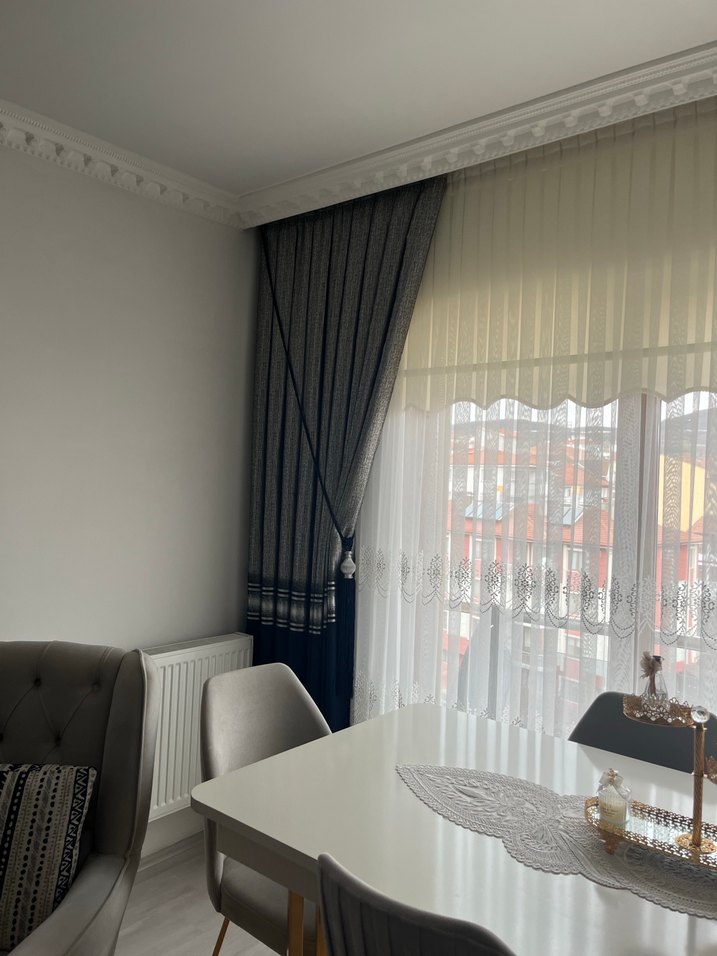 Gri renkte, desen içermeyen modern klasik perde, odanıza zarif ve sade bir görünüm kazandırır. Şeffaf beyaz tüllerle birlikte kullanılmıştır.