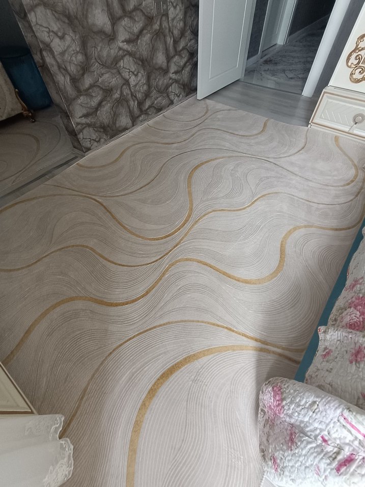 Modern klasik tarzda, gri zemin üzerine altın renkli soyut desenler içeren halı, mekâna şıklık katıyor. jel tabanlıdır. 6m2 tayin dolayisiyla satılıktir.