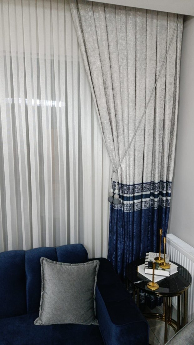 Modern klasik tarzda, gri ve lacivert tonlarında tie-dye desenli, dekoratif püsküllü fon perde.
