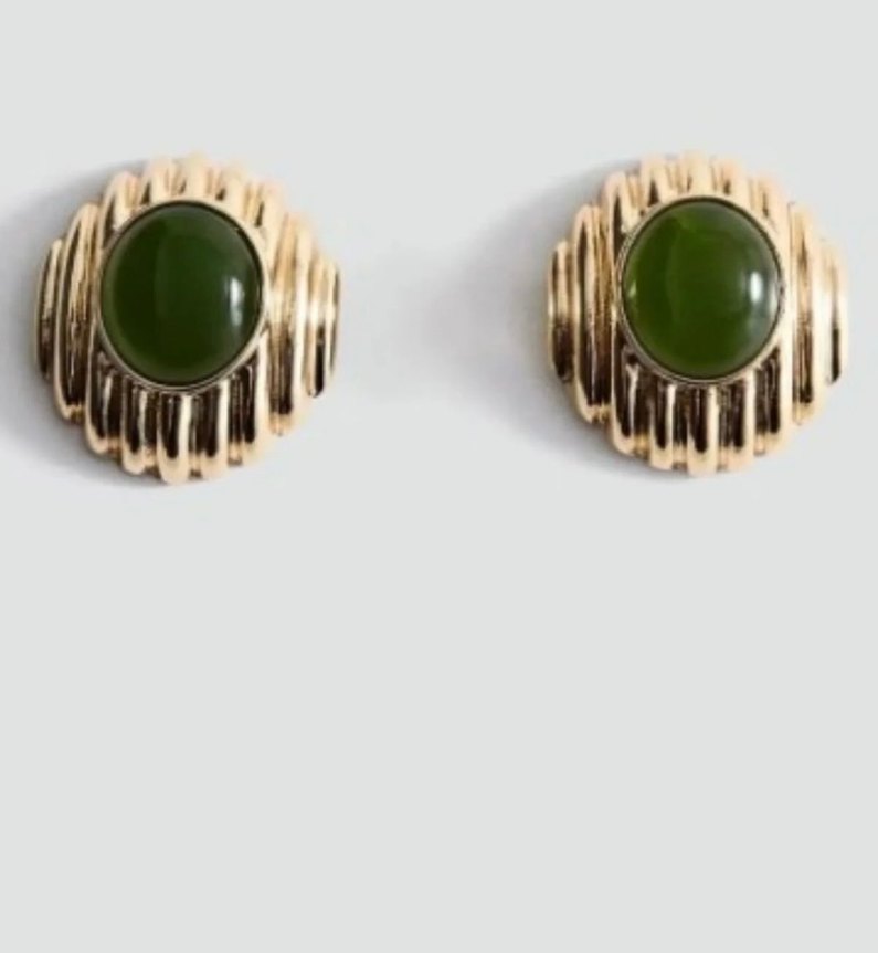 Parlak haki düğme küpeler, vintage cazibesiyle modern klasik tarzı birleştirir. Kısa ve desensiz, romantik akşamlar için klasik şıklık sağlar.