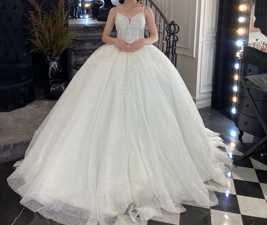 Beyaz prenses gelinlik, ince askılı, vücuda oturan üst kısma sahiptir. Uzun etek, ışıltılı ve gösterişli detaylarla modern klasik şıklık sunar.