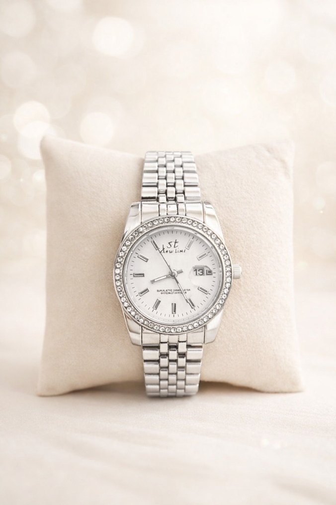 Parlak beyaz kadran Klasik tasarım ve metal bilezik içerir Tarih göstergesi ve taşlı çerçeve ile şık bir görünüm sunar. ⌚