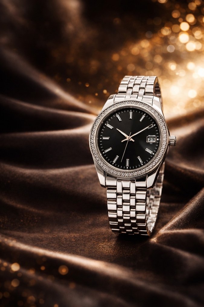 Parlak metal kayış ve tarih göstergeli Siyah kadranlı Modern klasik kadın kol saati Zamansız tasarım sunar. ⌚