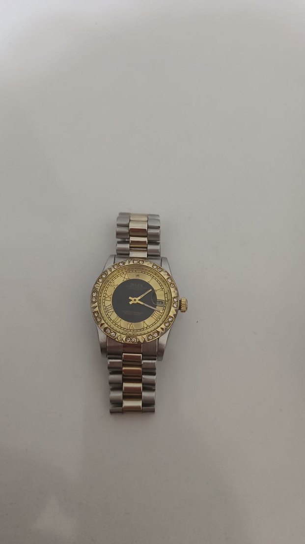 Modern klasik tasarıma sahip kqdın saati, koyu altın kadran ve altın-silver renkli metal bilezikle birleşiyor. ⌚ hiç kullanilmadi