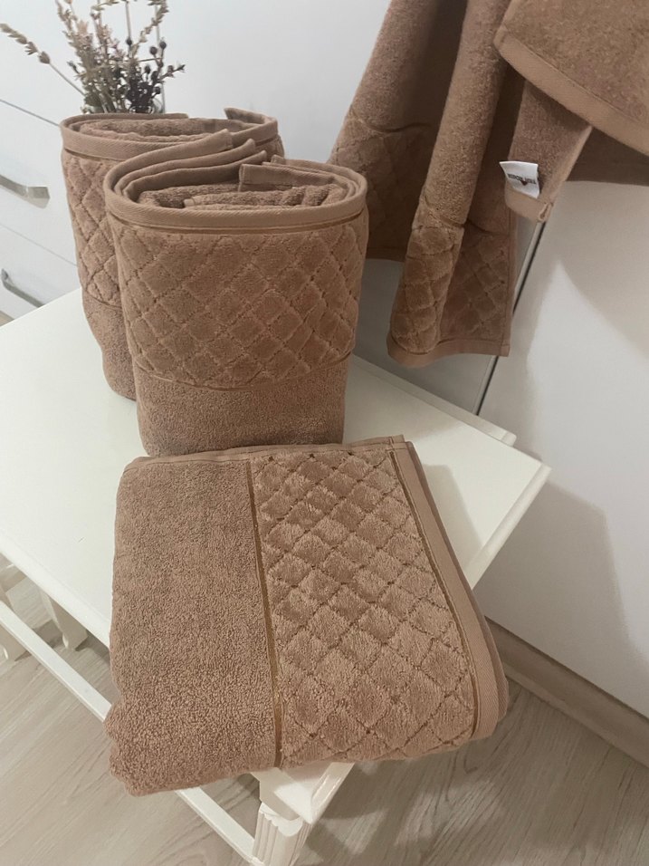Modern klasik tarzda, yumuşak dokulu kahverengi havlu, hafif kapitone desenli, kullanımı rahat.